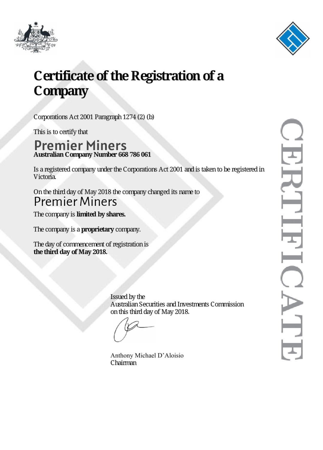 Premier Miners as a legal entity is registered in the Australia under company number 134567865. All relevant registration documents can be found on the official website of the state register of companies –the Companies House Australia.